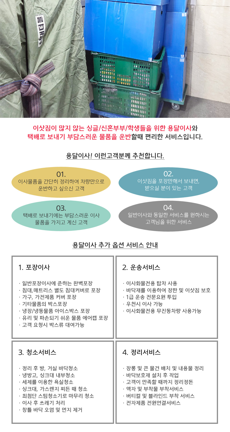 이삿짐 포장에서 운송, 이사 후 배치와 정리까지 업체에서 모두 대행해드리는 편리한 서비스입니다. 기본 포장, 운송, 배치와 함께 가전제품이나 특수물품 취급에 대한 부가서비스 또한 제공하고 있습니다.